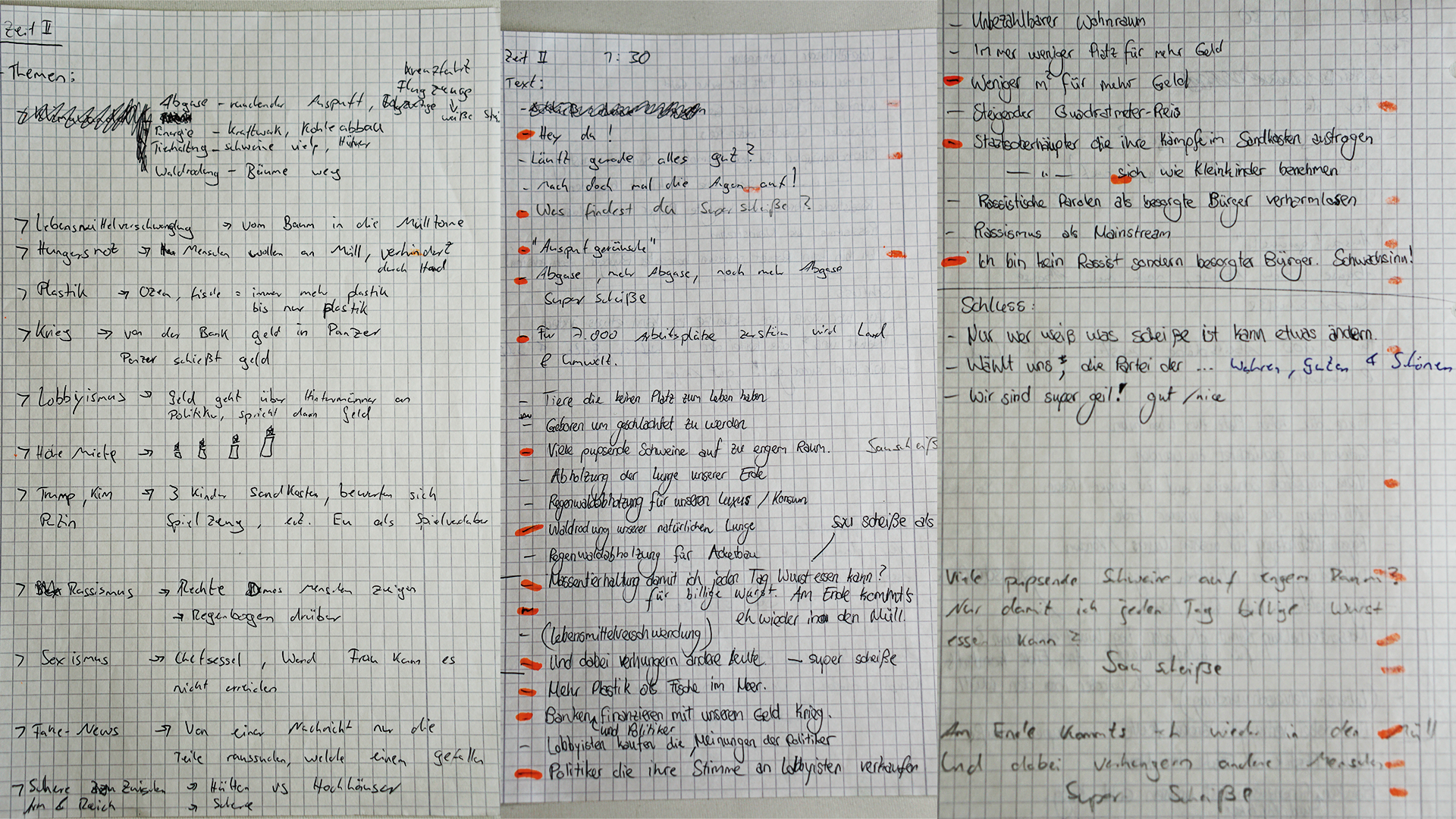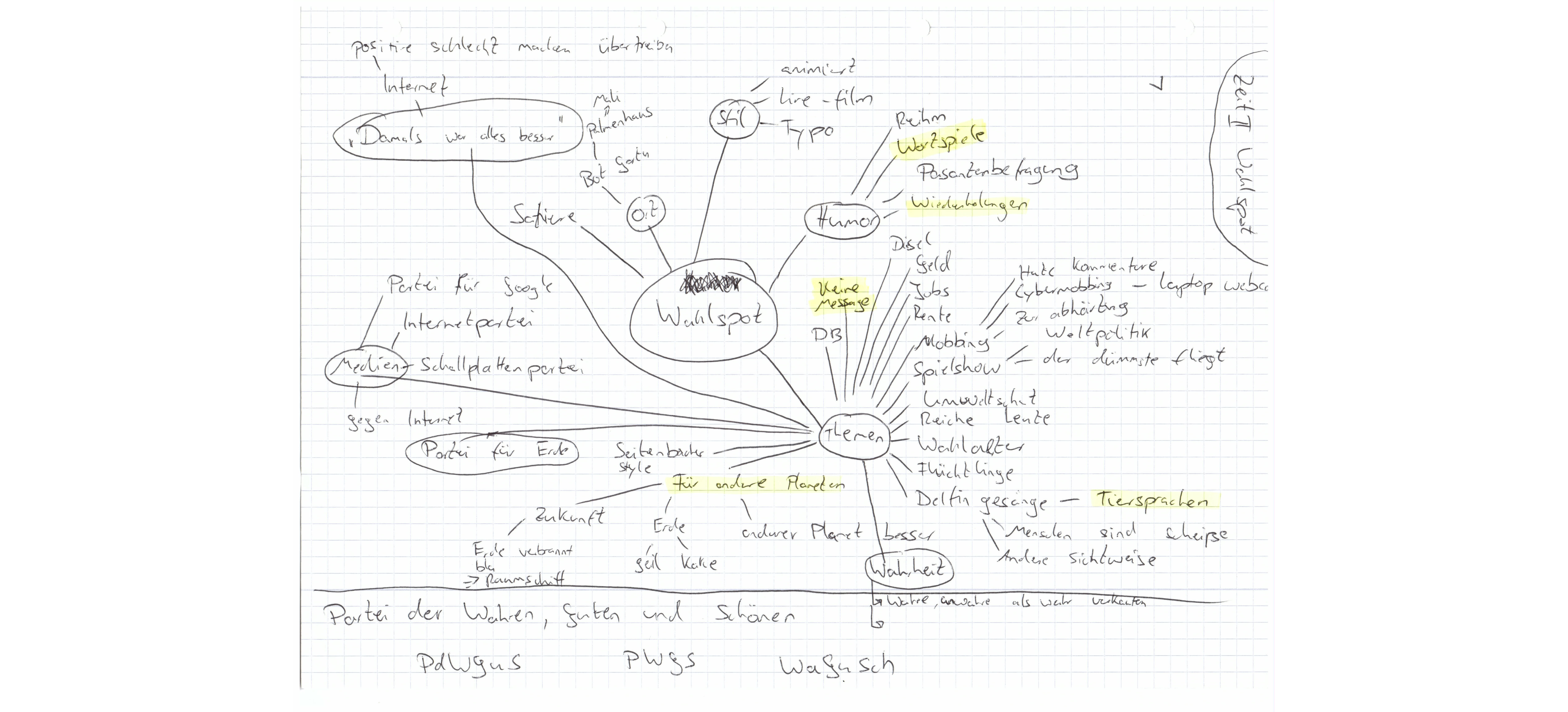 Wie auch beim ersten Konzept fertigten wir eine Stoffsammlung an. Wir schrieben also zunächst alles auf, was wir aktuell scheiße finden. Auch hier können Sie eine weitläufige Auflistung aus den Skizzen entnehmen.