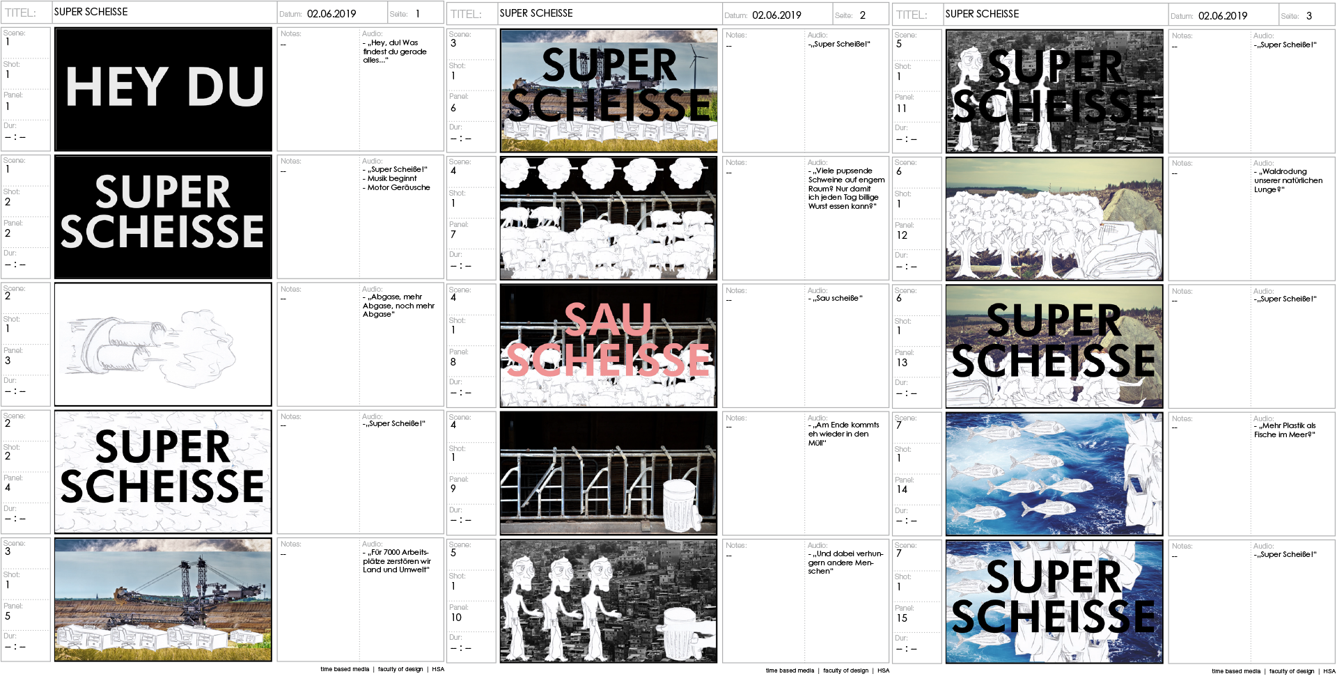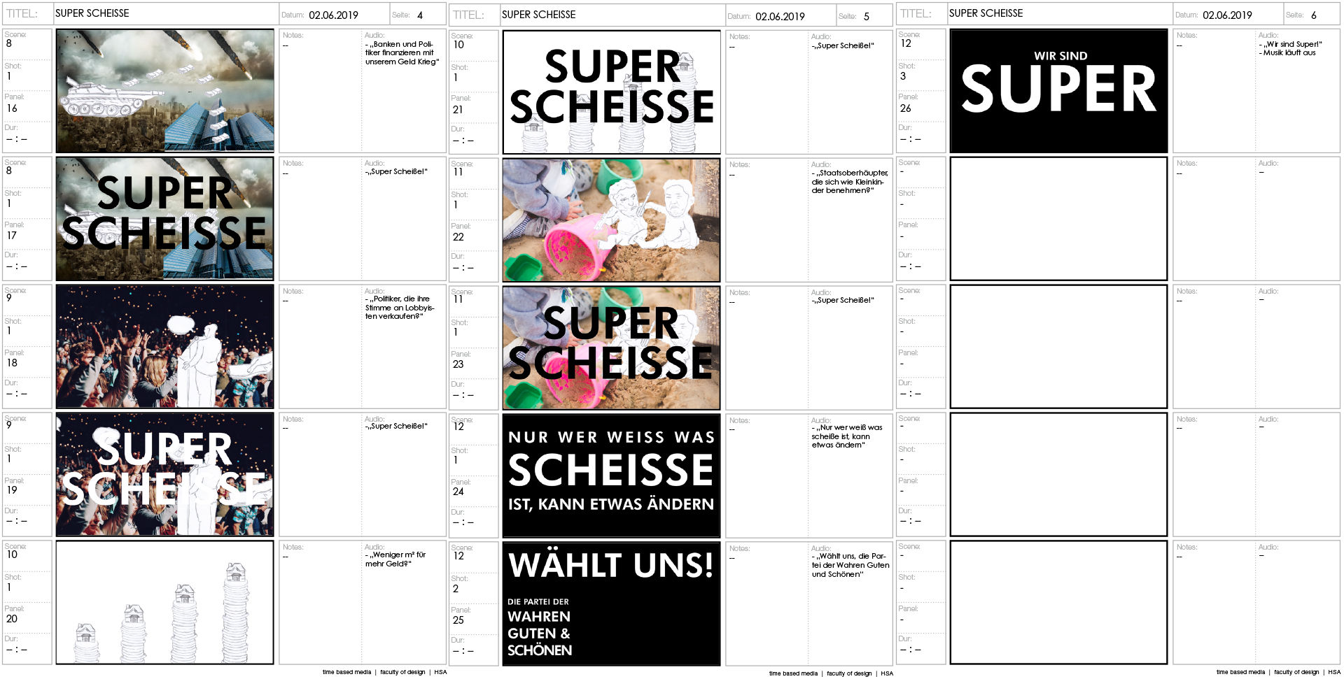 Nachdem wir uns nach der Konzeptionsphase für das Wahlspotprojekt „SUPER SCHEISSE“ entschieden hatten, ging es nun um die erste Visualisierung unserer Ideen. Die von uns gegebenen Rahmenbedingungen waren das Arbeiten mit Typo, ein gesprochener Monolog, sowie eine Stop Motion Collage aus verschiedensten Papierschnipseln in einer kontrastreichen abgedunkelten Farbgestaltung. Darauf aufbauend haben wir unseren Themen und Text formuliert, sowie schon einige Umsetzungsideen erarbeitet.