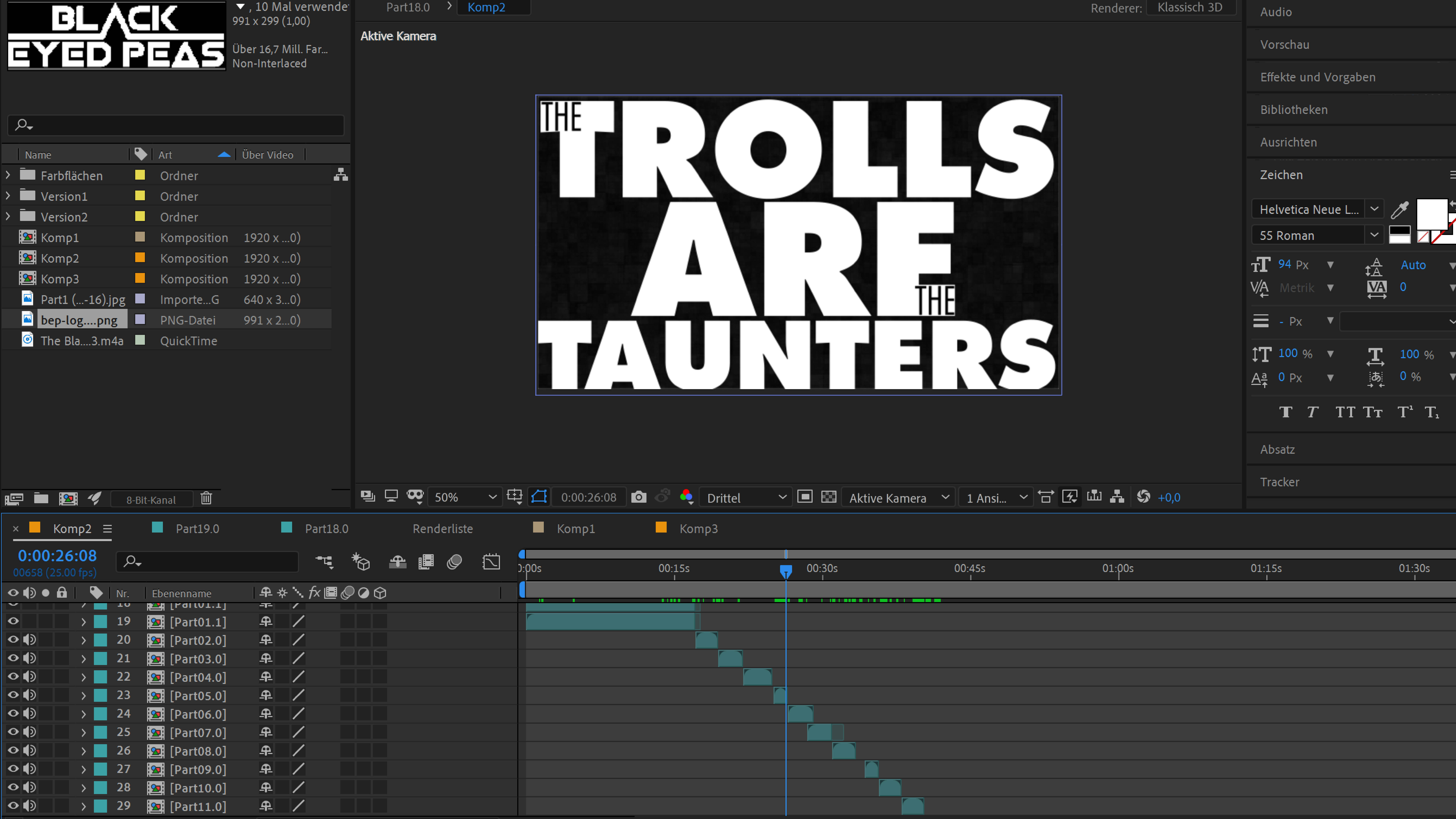 Der Part mit der amerikanischen Fahne gefiel mir nach einer Überarbeitung deutlich besser. Auch wurde ich etwas mutiger mit dem Anschneiden der typografischen Elemente. Der inhaltliche "Fehler" im Zeitsprung (0:26) wurde auch überarbeitet und ich verwendete nun einen zweigeteilten farbigen Hintergrund, anstelle des Schrägstrichs.