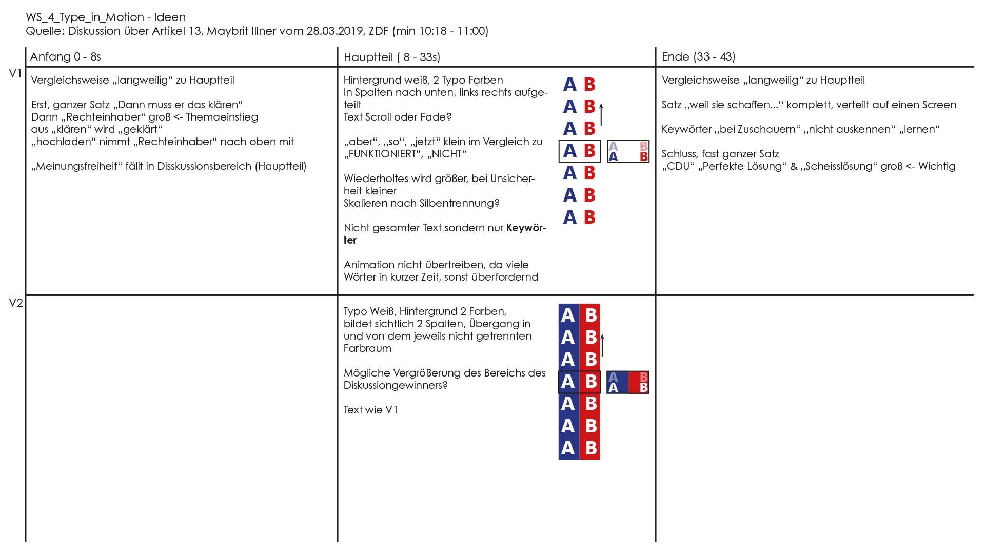 Ich versuchte zunächst mir einen groben Überblick zu verschaffen, welche Worte ich in ein "Chart" packen sollte. Ich probierte auch Animationen, welche ich zunächst im Kopf hatte zu notieren. Mit der Zeit experimentierte ich allerdings mehr im Programm selbst, als dass ich diese noch aufzeichnete.