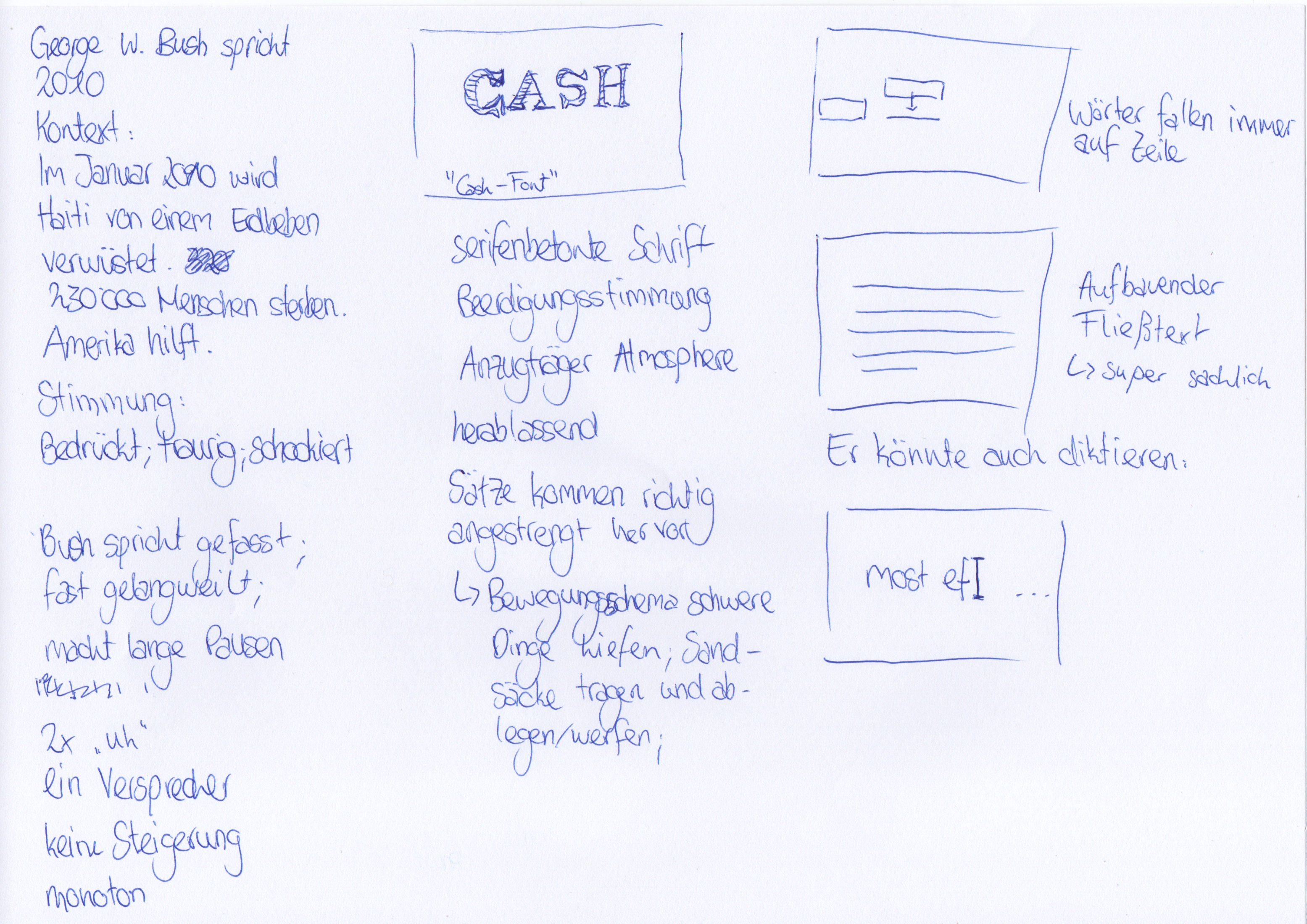 Da Obama in seiner Rede zwischen der Vergangenheit und Gegenwart springt, könnte ich diese Sprünge, sowohl mit einem Wechsel der Typografie, als auch der Farbgebung optisch darstellen.